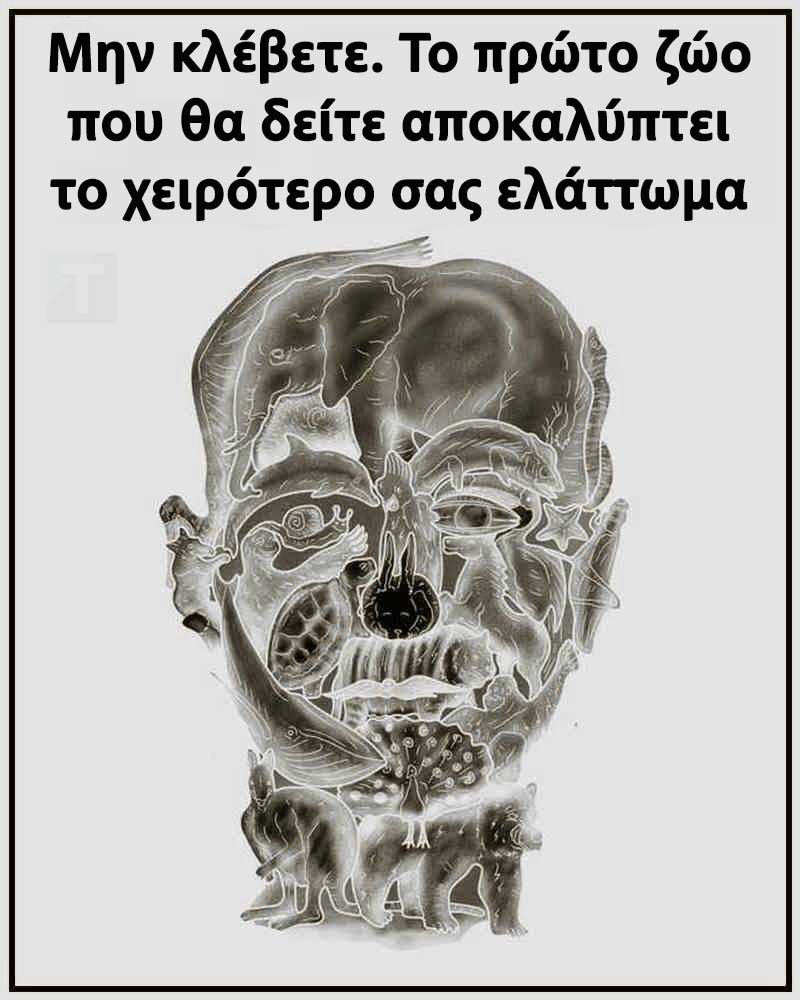 Αυτή τη φορά, δεν έχει σημασία μόνο τι βλέπεις, αλλά και τι μπορεί να αποκαλύψει αυτό για σένα. Η εικόνα, που μοιάζει αρχικά απλά με το περίγραμμα ενός ανθρώπινου προσώπου, κρύβει έξυπνα μέσα της διάφορα ζώα.