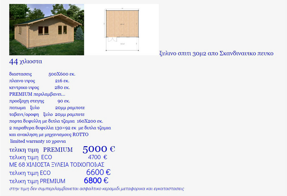 OLYMPOS 30m2. Ξύλινο σπίτι για εξοχικό, ξενώνα η αποθηκευτικό χώρο. Δέσμευση για την προστασία του περιβάλλοντος και των αειφόρων δασών, τουλάχιστον πέντε δένδρα αναφυτεύονται για κάθε δέντρο χρήσης