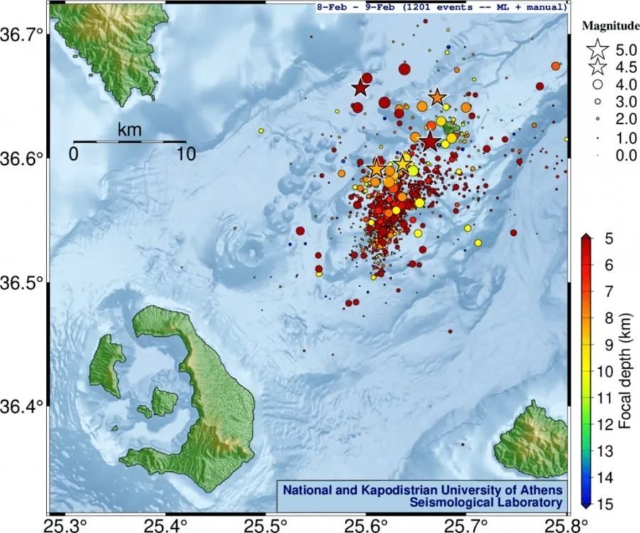 Από τις 26 Ιανουαρίου έως και τις 8 Φεβρουαρίου 2025, το Εργαστήριο Σεισμολογίας (ΕΣ) του ΕΚΠΑ (http://dggsl.geol.uoa.gr/) έχει εντοπίσει συνολικά στη ζώνη Σαντορίνης-Αμοργού πάνω από 12,800 σεισμούς με μεθόδους μηχανικής μάθησης, με αυστηρά κριτήρια για τη διασφάλιση της ποιότητας των αποτελεσμάτων. Σύμφωνα με τα στοιχεία καθημερινής ανάλυσης σεισμικών δεδομένων (χωρίς χρήση μεθόδων μηχανικής μάθησης) του Εργαστηρίου Σεισμολογίας του ΕΚΠΑ, κατά την 9η Φεβρουαρίου έχουν καταγραφεί 102 σεισμοί, εκ των οποίων 14 με μεγέθη M≥4.0 και 2 με Μ≥4.5, ενώ ο μεγαλύτερος σεισμός σημειώθηκε στις 21:05:40 (ώρα Ελλάδος) και είχε μέγεθος Μ=5.0.