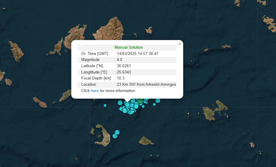Σεισμός 4 Ρίχτερ σημειώθηκε στις 16:57 το απόγευμα της Παρασκευής στη θαλάσσια περιοχή ανάμεσα στη Σαντορίνη και την Αμοργό.