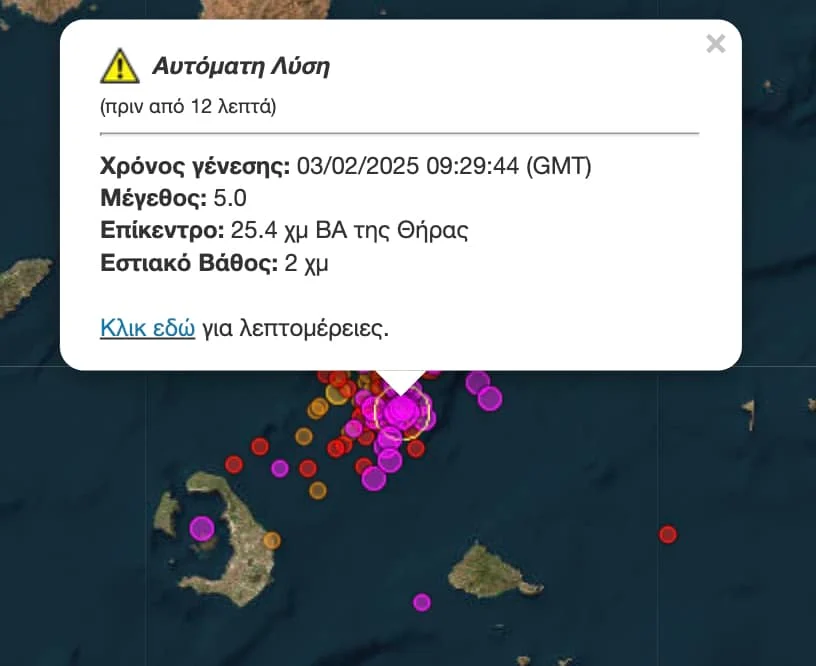 Σεισμός 5,0 ρίχτερ πριν από λίγο ανάμεσα στην Ανάφη και την Σαντορίνη στις 11.29 το πρωί της Δευτέρας.
