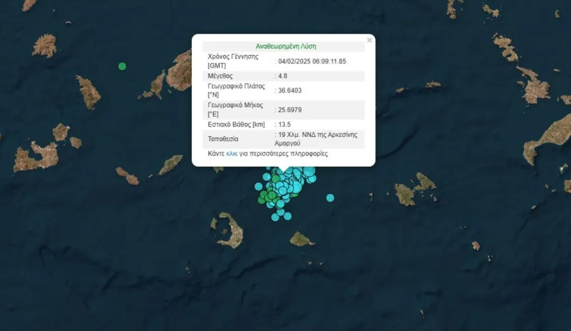 Σύμφωνα με πληροφορίες από parapolitika.gr, το ακριβές επίκεντρο της δόνησης εντοπίζεται στα 19 χλμ. Ν-ΝΔ της Αρκεσίνης Αμοργού