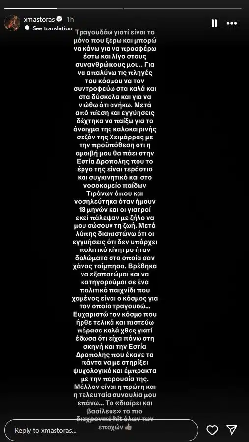 Μέσα από ανάρτησή του στο Instagram, ο Χρήστος Μάστορας ανέφερε πως «μετά από πίεση και εγγυήσεις δέχτηκα να παίξω για το άνοιγμα της καλοκαιρινής σεζόν της Χειμάρρας με την προϋπόθεση ότι η αμοιβή μου θα πάει στην Εστία Δρόπολης που το έργο της είναι τεράστιο και συγκινητικό και στο νοσοκομείο Παίδων Τιράνων».