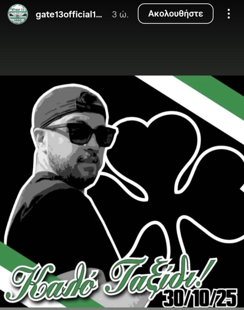 «Καλό ταξίδι, 30/10/25», αναφέρει το story που ανέβηκε στον επίσημο λογαριασμό της Θύρας 13 στο Instagram συνοδευόμενο από μια φωτογραφία του αδικοχαμένου νεαρού.