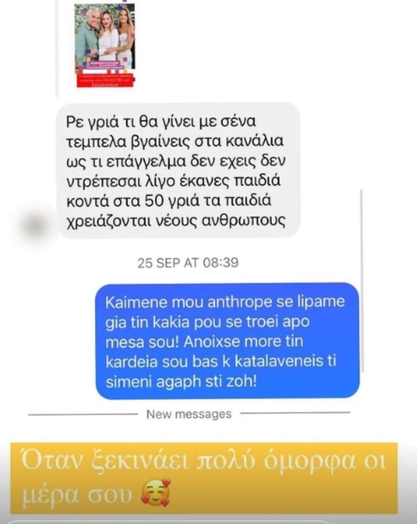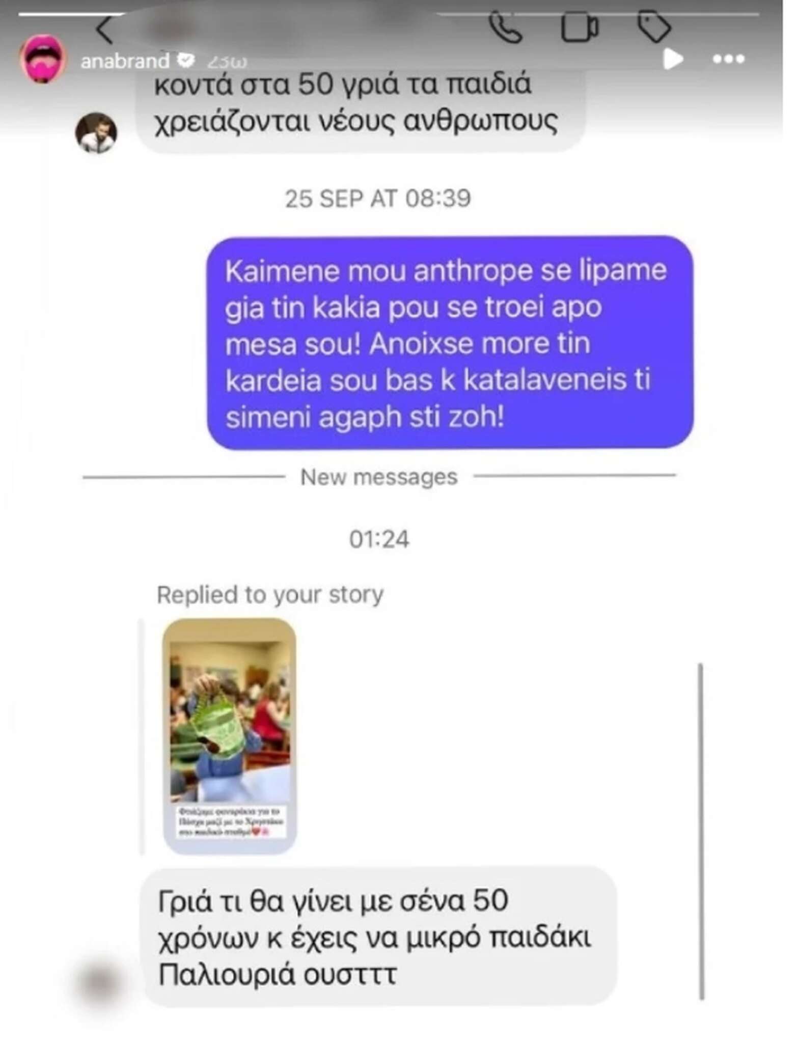 Συγκεκριμένα ο άνδρας αυτός της έγραψε: «Ρε γριά, τι θα γίνει με σένα; Τεμπέλα βγαίνεις στα κανάλια ως τι; Επάγγελμα δεν έχεις, δεν ντρέπεσαι λίγο; Έκανες παιδιά κοντά στα 50, γρια. Τα παιδιά χρειάζονται νέους ανθρώπους!». H Αννίτα Μπράντ του απάντησε: «Καημένε μου άνθρωπε, σε λυπάμαι για την κακία που σε τρώει από μέσα σου! Άνοιξε μωρέ την καρδιά σου, μπας και καταλάβεις τι σημαίνει αγάπη στη ζωή».