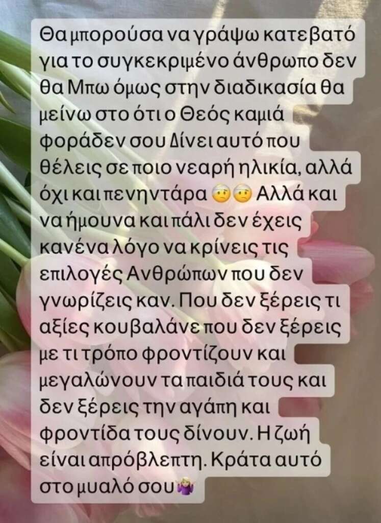 «Θα μπορούσα να γράψω κατεβατό για τον συγκεκριμένο άνθρωπο, δεν θα μπω όμως στη διαδικασία. Θα μείνει στο ότι ο Θεός καμιά φορά δεν σου δίνει αυτό που θέλεις σε πιο νεαρή ηλικία. Αλλά όχι και πενηντάρα. Αλλά και να ήμουν, και πάλι δεν έχεις κανέναν λόγο να κρίνεις τις επιλογές ανθρώπων που δεν γνωρίζεις καν. Που δεν ξέρεις τι αξίες κουβαλάνε, που δεν ξέρεις με τι τρόπο φροντίζουν και μεγαλώνουν τα παιδιά τους, και δεν ξέρεις την αγάπη και τη φροντίδα που τους δίνουν. Η ζωή είναι απρόβλεπτη. Κράτα αυτό στο μυαλό σου», σημείωσε η Αννίτα Μπραντ και το ανέβασε σε Instagram Story.
