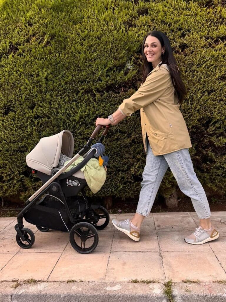 Σε πρωηγούμενη φωτογραφία της, η Ιωάννα Τριανταφυλλίδου κρατάει το καρότσι και χαμογελάει στον φακό.