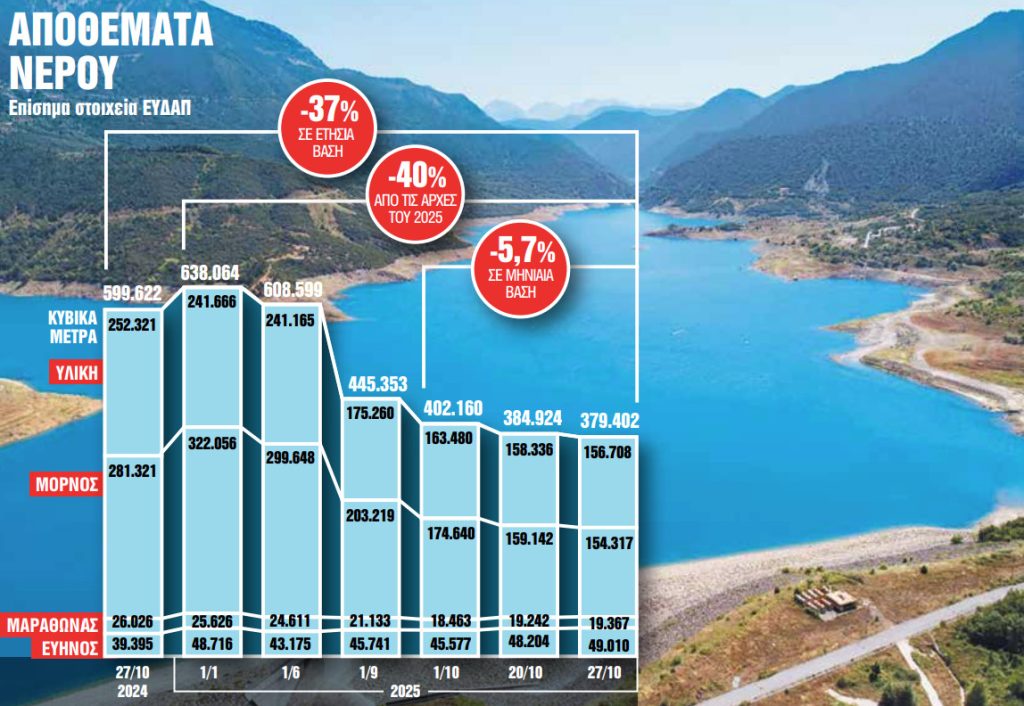 Σύμφωνα με τα στοιχεία της ΕΥΔΑΠ, στις 27 Οκτωβρίου 2025, οι ταμιευτήρες – έγιναν τέσσερις με την προσθήκη του Εύηνου το 2002 – περιείχαν συνολικά λιγότερα από 380 εκατομμύρια κυβικά μέτρα νερού, δηλαδή περίπου το 25% της συνολικής τους χωρητικότητας.