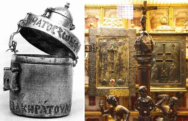 Αλλά και η Ιερά Μονή Βατοπαιδίου του Αγίου Όρους θρυλείται πως περιέχει σταγόνες από το Άχραντο Αίμα του Ιησού. Πλάι στο μεγάλο τμήμα του τιμίου ξύλου που φυλάσσεται στη Σταυροθήκη Τιμίου Ξύλου, περιγράφεται σε παλαιότερους καταλόγους πως μέσα στα φατνώματα της σταυροθήκης υπάρχουν λείψανα από τα μαλλιά αλλά και τα σπάργανα (φασκιές) του Χριστού, καθώς και το αίμα του…