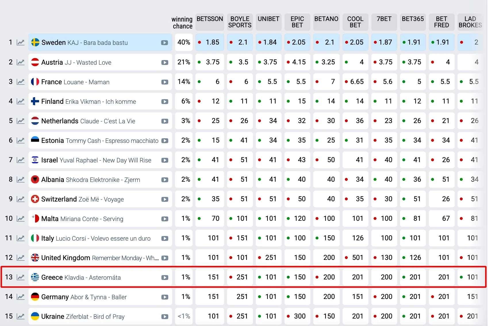 Ολλανδία, Φινλανδία, Ισραήλ, Εσθονία, Ελβετία, Αλβανία και Μάλτα, σύμφωνα πάντα με τις στοιχηματικές, συμπληρώνουν την πρώτη δεκάδα.